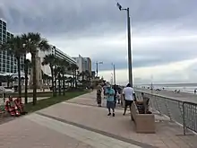 The Daytona Beach Boardwalk consists of the concrete promenade which was installed in the late 1920s, followed by the bandshell and coquina embellishments which were completed in 1938. It is a structure located on the beach in Daytona Beach, Florida at the east end of Main Street, east of Ocean Avenue. It is open seven days a week and consists of a concrete walkway with various stores and shops including the City Walk shopping and entertainment complex, hotels, gift shops, amusement centers, arcades, restaurants and bars. It also features outdoor and indoor rides like the Ferris wheel, Slingshot, Hurricane, Tilt-O-Whirl, go-carts and formerly a roller coaster called the Sand Blaster.[1] Free concerts are given in the summer at the Bandshell on the north end of the area. The Daytona Beach Pier, also known as the Main Street Pier, was built by Thomas Keating in the late 1800s.[2] The pier begins at the east end of Main Street, south of the boardwalk and extends 1,000 feet into the Atlantic Ocean.[3][4]