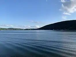 DeRuyter Reservoir (also known as Tioughnioga Lake)[2] is a man-made lake located north of Puckerville, New York. Fish species present in the lake include smallmouth bass, pickerel, yellow perch, rock bass, black bullhead, common sunfish, and walleye. There is access by fee on the south shore at the general store.[3] The reservoir was constructed from 1861 to 1863 to supply water for the Erie Canal but by the following year had proved to hold insufficient water. The dam has been worked on at least twice, draining the lake by several inches each time.