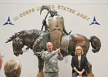 Since 1985, the Death Dealer has been used as the mascot of III Corps (United States). A life-size metal statue of the Death Dealer stands outside the III Corps headquarters building in Fort Hood, Texas. The statue was unveiled in September 2009[2] and was an exact replica of a piece sculpted by Randy Bowen and produced by Dark Horse Comics in 2003.[3] Two full-size painted resin statues are on display in the atriums on the III Corps Headquarters. During III Corps' 2009-2010 deployment to Camp Victory, Iraq, one of the painted resin statues was shipped and joined the unit at Al Faw Palace and was on display in the rotunda. Also, the United States Marine Corps helicopter squadron VMM-164 has the Death Dealer as their mascot.