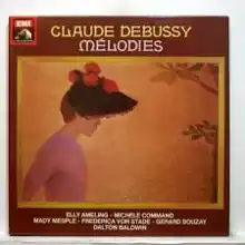 Debussy Mélodies is a 178-minute studio album of sixty of Claude Debussy's art songs, presented roughly in order of composition, performed by Elly Ameling, Michèle Command, Mady Mesplé, Frederica von Stade and Gérard Souzay with piano accompaniment by Dalton Baldwin. It was released in 1980.