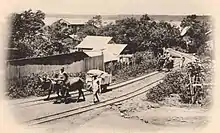 The 600 mm (1 ft 11+58 in) gauge Decauville railway was built in 1900 from Antsirane (now Antsiranana) to the Tunisian Fountain (Fontaine Tunisienne) at today's STAR factory.[1] It started at the port and ran on the Rue Gouraud and the Boulevard Bazeilles up to the Cercle Français (now Suarez Art) and up the Boulevard Militaire. It turned into the Boulevard de Sakaramy at the height of Camp Lubert, from where it led past the present town hall to l'Octroi and the Tunisian Fountain. At the end of 1900, it was extended from the Tunisian Fountain via Antanamitara and Andranomanitra to the junction of today's road to Joffreville.[2][1]