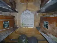 Interior of the Ball mausoleum at St Pancras and Islington Cemetery with memorial plaque from his employees.