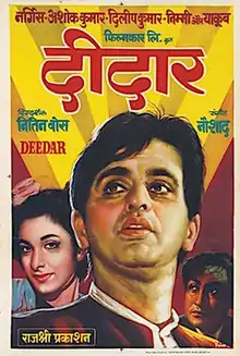 Deedar is a 1951 Hindi-language romantic musical film directed by Nitin Bose, starring Dilip Kumar, Nargis, Ashok Kumar and Nimmi. It is a story of unfulfilled love, where the hero's childhood love is separated from him due to class inequalities. It is one of noted tragedies made in early Hindi cinema. It became a popular film of the Golden era and further established Dilip Kumar as the "King of Tragedy".[1][2]
