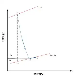 Where 1 to 3ss in Figure 1 represents the isentropic process beginning from stator inlet at 1 to rotor outlet at 3. And 2 to 3s is the isentropic process from rotor inlet at 2 to rotor outlet at 3. The velocity triangle[2] (Figure 2.) for the flow process within the stage represents the change in fluid velocity as it flows first in the stator or the fixed blades and then through the rotor or the moving blades. Due to the change in velocities there is a corresponding pressure change.