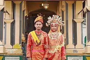![]() A bride and groom wearing traditional Deli Malay clothes | |
