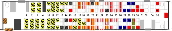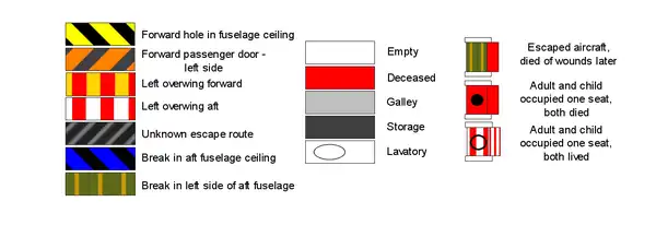 Seating chart for Flight 1141 including occupant survival and, if known, egress route.