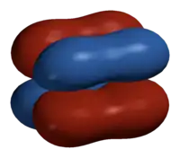 In chemistry, delta bonds (δ bonds) are covalent chemical bonds, where four lobes of one involved atomic orbital overlap four lobes of the other involved atomic orbital. This overlap leads to the formation of a bonding molecular orbital with two nodal planes which contain the internuclear axis and go through both atoms.[1][2][3][4]