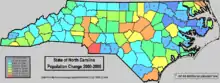 Change in population from 2000 to 2008, using census estimates. Note the large-scale area of net population loss in the inland northeastern part of the state; they contained the highest percentage of African Americans, according to the Census 2000 data; but many have left for jobs in urban areas.[2]