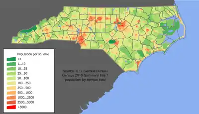 With two-thirds of North Carolina's population living in the middle one-third of its landmass, the middle third of the state is about four times more densely populated than the remaining two-thirds.