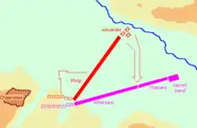 In 335 BC Alexander felt free to engage the Thracians and the Illyrians, but, while he was campaigning in the north, Demosthenes spread a rumour—even producing a bloodstained messenger—that Alexander and all of his expeditionary force had been slaughtered by the Triballians.[105] The Thebans and the Athenians rebelled once again, financed by Darius III of Persia, and Demosthenes is said to have received about 300 talents on behalf of Athens and to have faced accusations of embezzlement.[j] Alexander reacted immediately and razed Thebes to the ground. He did not attack Athens, but demanded the exile of all anti-Macedonian politicians, Demosthenes first of all. According to Plutarch, a special Athenian embassy led by Phocion, an opponent of the anti-Macedonian faction, was able to persuade Alexander to relent.[106]