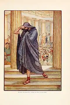 Illustration by Walter Crane of Demosthenes leaving the Assembly in shame after his first failure at public speaking, as described by Plutarch in his Life of Demosthenes