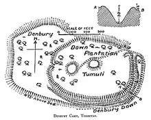 The fort is less than a kilometre south west of the village,[3] occupying the entire hilltop of Denbury Down at 160 metres above sea level. It is surrounded on the south and east sides by high embankments. In the centre of the enclosure there are two large burial mounds.[4][lower-alpha 1]