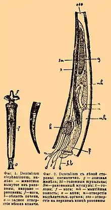 Dentalium elephantinum, the elephant tusk, is a species of scaphopod mollusc. Its shell is often deep green fading to white at its tip and has between eight and 17 strong ribs along its sides. Adults are about 70 mm in length with an diameter of about 11 mm at the shell aperture. It is native to Amboyna, the Philippine Islands, and the Red Sea.[2]