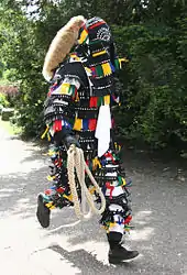 The character Hänsele appears on the Saturday and Sunday before Ash Wednesday.[2] It also appears in July in connection with the Überlinger Schwerttanzkompanie (Sword dance company of Überlingen) at the second Schwedenprozession (a procession to commemorate the successful defense of the Swedish siege in the Thirty years War) on the second Sunday in July. During the sword dance only one person at a time plays Hänsele, and he is involved in all civic celebrations; his identity usually remains anonymous. Hänsele's costume is noted for its colorful felted squares, its fox tail, and the women's perfume worn on the mask. In addition, Hänsele carries a heavy whip; prior to Fasnet, groups of uncostumed Hänseles gather in the market square to practice snapping their whips.