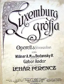 Lehár composed Der Graf von Luxemburg in only three weeks and in a private remark before its premiere called it "Sloppy work, completely worthless!"[1] However, it became his first major international success after The Merry Widow.[2] Between those operettas, he had composed two one-act stage works, Peter und Paul reisen ins Schlaraffenland (Peter and Paul Travel to Paradise) and Mitislaw der Moderne (Fashionable Mitislaw), followed by his indifferently received three-act operetta Der Mann mit den drei Frauen (The Man with Three Wives) in 1908 and the somewhat more successful Das Fürstenkind (Maids of Athens) which premiered in October 1909, one month before Der Graf von Luxemburg.[3]
