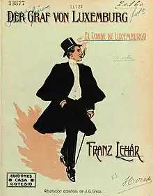 Following its Vienna premiere, Der Graf von Luxemburg was soon performed internationally. It premiered in Germany at Berlin's Neues Operettenhaus on 23 December 1909 and in Hungary a month later as Luxemburg grófja with the libretto translated into Hungarian and adapted by Andor Gábor.[9] When performed outside German-speaking countries the operetta was almost invariably performed in translation, often with the libretto significantly adapted to local theatrical tastes. It was first performed in Italy as Il conte di Lussemburgo at the Teatro Vittorio Emanuele in Turin in 1910, and in France as Le comte de Luxembourg (in a translation by Robert de Flers and Gaston de Caillavet) at the Théâtre Apollo in 1912.[10] The Spanish version premiered at the Teatro Eslava in Madrid as El conde le Luxemburgo in 1910. However, this version was significantly altered from the original. The libretto was adapted and translated by José Juan Cadenas, and the Spanish composer Vicente Lleó Balbastre not only rearranged Lehár's music but also added some music of his own. A year later, Lleó collaborated with the composer Enrique Bru and two new librettists to create a one-act zarzuela, El conde del embudo, even more loosely based on Lehár's original. Der Graf von Luxemburg arrived in Latin America soon after its premiere thanks to travelling operetta companies from Europe. It received its Uruguayan premiere in 1910 at the Teatro Solis in Montevideo performed in the original German and was subsequently performed there for many years, although after the premiere always in either Italian or Spanish translation.[11] A Portuguese company from Porto performed the work in Portuguese translation as O conde de Luxemburgo at the Teatro Amazonas in Brazil in 1913.[12]
