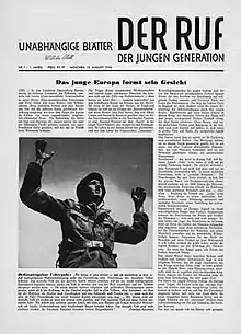 After returning to Germany Andersch and Richter, along with several others from Fort Kearny, founded a new newspaper, also called Der Ruf.[2]:ix–x[3] This iteration of Der Ruf grew to a circulation of 100,000 subscribers.[3] It promoted socialist and democratic ideals while harshly criticizing the American occupation.[3] They intended to use this paper to promote the idea that the war had provided Germany with the opportunity to rebuild the entire society in a way that would promote peace in Europe.[2]:ix–x They wanted Germany to unite with the rest of Europe, but they became frustrated with the allied occupation of Germany.[3][2]:x They did not want Germany to be dominated by either the United States or the Soviet Union.[3][2]:x At times the paper was seen as being overly nationalistic.[3] The growing antagonism between the United States and Soviet Russia, along with their refusal to take sides led American military authorities to remove Andersch and Richter as editors of the paper in 1947, at which point they founded Group 47.[2]:x After their departure, they were replaced as editors by Erich Kuby.[2]:xiv