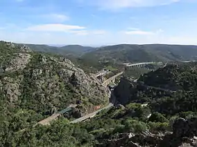 Despeñaperros (literally, [cliff where] dogs plunge) is a gorge or canyon carved out by the Despeñaperros river. It is located in the municipality of Santa Elena in the northern portion of the province of Jaén, Spain. The 76.49-square-kilometre (29.53 sq mi) area was declared a natural park by the Andalusian Autonomous Government, primarily for its geology and landscape, but also for its notable flora and fauna.