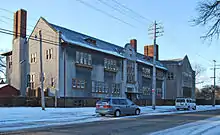 In 1913, the school decided to develop an eastern branch campus to serve students on the city's east side.[7] This site in Indian Village along Charlevoix was chosen, and the school again contracted Albert Kahn to design a new building.[8][9] The building is one of only three schools designed by Kahn, and the only one still extant.[10] Kahn's design for the school drew from then-popular English influences,[11] and was a radical departure from previous school designs, both in his extravagant use of windows and use of stucco rather than brick.[9] The building opened the following year as the "Eastern Liggett" branch.[8] In 1916, landscape architect O. C. Simonds designed a landscape plan for the school.[12]