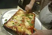 He makes 100 to 150 pies a day.[10][11][12][13] DeMarco uses imported ingredients – flour, extra-virgin olive oil, San Marzano tomatoes, buffalo mozzarella cheese from Casapulla, freshly grated grana padano (a slightly salty hard cow's milk cheese), three types of mozzarella cheese, and hand-grated Parmigiano Reggiano cheese are all from Italy, and the basil and oregano are from Israel.[10][11][13][14][15] In a windowsill flower box, he grows thyme, oregano, basil, rosemary, and hot peppers. He cuts fresh basil over each pie with a pair of kitchen scissors.[10][3][16][17][18] The pizzas bake for a few minutes at about 800 °F (427 °C).[13][19] In July 2009, Di Fara raised its price for a plain slice of pizza from $4 to $5, becoming the first $5-a-slice pizza place in New York City.[11][20]