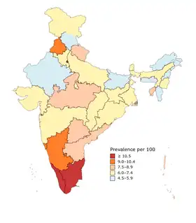 The number of people with diabetes in India has increased from 26 million in 1990 to 65 million in 2016.[1] According to the 2019 National Diabetes and Diabetic Retinopathy Survey report released by the Ministry of Health and Family Welfare, the prevalence was found to be 11.8% in people over the age of 50.[11] The prevalence of diabetes is 6.5% and prediabetes 5.7% among the adults below the age of 50 years, according to the DHS survey.[12] The prevalence was similar in both male (12%) and female (11.7%) populations. It was higher in urban areas.[13] When surveyed for diabetic retinopathy, which threatens eyesight, 16.9% of the diabetic population aged up to 50 years were found to be affected. Per the report, diabetic retinopathy in the 60-69-years age group was 18.6%, in the 70-79-years age group it was 18.3%, and in those over 80 years of age it was 18.4%. A lower prevalence of 14.3% was observed in the 50-59-years age group.[11] High prevalence of diabetes is reported in economically and epidemiologically advanced states such as Tamil Nadu and Kerala, where many research institutes which conduct prevalence studies are also present.[14]