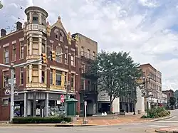 "The Diamond" (pictured), erected by George Gaston in 1884, was the first four-story brick building in East Liverpool and is located in this district.[2]