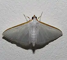 Diaphania costata, the orange-shouldered sherbet moth or erroneously the white palpita moth, is a moth of the family Crambidae. The species was first described by Johan Christian Fabricius in 1794. It is widely dispersed, being found in the Indomalayan realm, as well as Europe. It is also found in Mexico and Texas, possibly having been introduced accidentally.