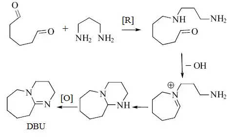 Although all commercially available DBU is produced synthetically, it may also be isolated from the sea sponge Niphates digitalis.[4] The biosynthesis of DBU has been proposed to begin with 1,6-hexanedial and 1,3-diaminopropane.