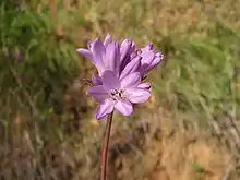 Its tall, thin, naked stem is topped with an inflorescence packed densely with six to 15 flowers, each about a centimeter wide and long, with usually six petal-like lobes in shades of bright purple.