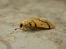 The wingspan is about 20 mm. Adults are bright yellow, with black zig-zag lines across the wings, and a prominent black spot near the middle of each forewing.[2]