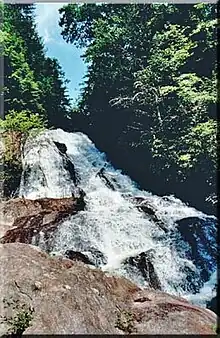 Dick's Creek Falls is a waterfall that features a 60 ft (18 m) drop of Dicks Creek into the Chattooga River. Located in the Chattahoochee National Forest, it is reached by using the Dick's Creek Trail, which is short trail (about 1.4 miles in and out) that connects to the Bartram Trail in eastern Rabun County, Georgia.