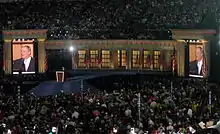 In 1982, Durbin won the Democratic nomination for the 20th congressional district, which included Macon and most of Springfield. He scored a 1,400-vote victory, defeating 22-year incumbent Paul Findley, a U.S. Navy veteran, whose district lines had been substantially redrawn to remove rural farms and add economically depressed Macon. This replaced 35% of the voters[7][8] and included more Democrats as part of the decennial redistricting. Durbin's campaign emphasized unemployment and financial difficulties facing farmers, and told voters that electing him would send "a message to Washington and to President Reagan that our economic policies are not working." Durbin benefited from donations by pro-Israel groups, especially AIPAC,[9] that opposed Findley's advocacy on behalf of the Palestine Liberation Organization[10] in the year before the election. Durbin was reelected six times, rarely facing substantial opposition, and winning more than 55% of the vote in each election except 1994.[11][12][13]