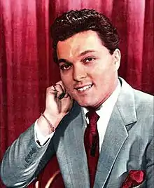 In November 1954, Valentine was invited to sing at the Royal Command Performance, and in February 1955 he was top billed at the London Palladium. He also cracked jokes and impersonated entertainers, including Johnnie Ray, Frankie Laine, Mario Lanza and Billy Daniels.[6] He recorded two number one hits, "Christmas Alphabet" and "The Finger of Suspicion (Points at You)". His first chart-topper came only two months after his marriage to Elizabeth Flynn at Caxton Hall, which caused scenes of hysteria and was widely expected to sound the death knell to his career.[7] In fact, 1955 was by far his best chart year, with both the number ones and three others placed in the Top Ten. [7] While his second number one saw Valentine playing 'King Canute' to Bill Haley's incoming tide of rock and roll, "Christmas Alphabet" marked the first time in the UK that a song created for the Christmas market would hit number one.[7] In April 1955, Valentine again topped the bill at the London Palladium for two weeks, a month after winning the male vocalist category in the NME poll.[8] He went on to win this title consecutively from 1953 to 1957.[9]