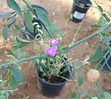 The inflorescence is a pinkish violet flower surrounded by pairs of large, heart-shaped, green bracts, usually occurring in groups of 3.[1]: 74