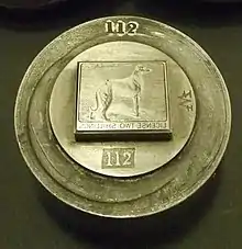 A die for a dog license stamp issued in Ireland, 1865–1928.