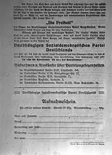 Die Freiheit ('Freedom') was a daily newspaper published from Berlin between 1918 and 1922 as well as between 1928 and 1931. Die Freiheit was the organ of the Independent Social Democratic Party of Germany (USPD).[1] Among the editor-in-chiefs of the newspaper were Rudolf Hilferding and Wilhelm Dittmann.[2]