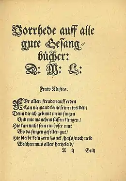 The reformer Martin Luther wrote the text as part of a longer poem of praise, not intended to be sung.[1] The topic is firstly praise of music, especially singing, which turns to praise of God.[1] The long poem appeared as a preface of a 1538 publication by Johann Walter, Lob vnd preis der loblichen Kunst Musica, praising the art of music. Luther's preface was titled Vorrede auf alle guten Gesangbücher (Foreword on all good hymnals), subtitled Lob der Frau Musica (The praise of Lady Music), with Music speaking. Luther's poem appears also in the Klug'sches Wittenberger Gesangbuch of 1543.[1]