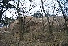 The Diederichs's stone (German: Diederichsstein, Chinese: ; pinyin: bēi) was a German monument in the city of Qingdao to commemorate Admiral Otto von Diederichs and the German occupation of the Kiautschou Bay concession on 14 November 1897. The monument was dedicated on 21 November 1898 by Prince Henry of Prussia.[1] It was located at an elevation of 98 m, about halfway up the southwestern slope of the Signal Hill, the official German name of the mountain at the time was "Diederichsberg".[2] Its most prominent feature was a plate decorated with the imperial eagle of the German Empire and the inscription "For him who won for Kaiser and Reich the land all around, let this rock be named Diederichs's stone" ("Der hier für Kaiser warb u. [und] Reich ringsher das Land, nach ihm sei dieser Felsen Diederichsstein genannt").[3] Below the plate was a rock inscription that read, "In this place on 14 November 1897, Admiral v.[von] Diederichs took possession of the Kiautschou territory" ("Am 14. November 1897 ergriff an dieser Stelle der Admiral v.[von] Diederichs Besitz vom Kiautschou Gebiet"). A separate Chinese inscription was located to the right-hand side of the German text. The entire monument stood about 5 meters tall.