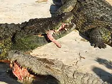 Larger fish, like catfish and freshwater bass, are preferred by adults more than 2.2 m (7 ft 3 in) in length. Particularly small fish are likely to be eaten only in case of sudden encounter, mostly in shallow, dry-season ponds where not much effort is needed to catch the small, agile prey.[13] Most observed fishing by crocodiles takes place in waters less than 1.5 m (4 ft 11 in) deep and fish are often caught when they swim into contact with the crocodile's head, even literally right into the reptile's mouth.[5] Across much of their range, they take any fish they encounter, but largish and relatively sluggish mesopredator fish such as lungfish and Barbus carp seem to be most widely reported. Many other genera are taken widely and relatively regularly, including Tilapia (which was the most significant prey genus in Lake Turkana), Clarias, Haplochromis, and Mormyrus.[4][5][14] In Uganda and Zambia, lungfish comprised nearly two-thirds of the piscivorian diet for crocodiles.[4] Similarly, in Lake Baringo, the lungfish is the crocodile's main prey and the crocodile is the lungfish's primary predator.[15] In the Okavango Delta, the African pikes (Hepsetus spp.) were the leading prey group for subadults, comprising more than a fourth of the diet.[16] Extremely large fish, such as Nile perch (Lates niloticus), goliath tigerfish (Hydrocynus goliath), and even sharks, are taken on occasion, in addition to big catfish, such as Bagrus spp. and Clarias gariepinus, which are preyed upon quite regularly in areas where they are common. In the Zambezi River and Lake St. Lucia, Nile crocodiles have been known to prey on bull sharks (Carcharhinus leucas) and sand tiger sharks (Carcharias taurus).[17][18][19] The largest fishes attacked in such cases may potentially weigh more than 45 kg (99 lb).[20][21]