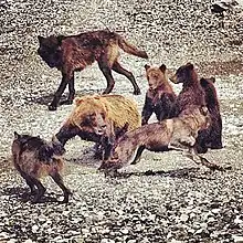 Brown bears regularly intimidate gray wolves (Canis lupus) away from their kills, with wolves occurring in most of the brown bear's worldwide distribution.[2] In Yellowstone National Park, brown bears pirate wolf kills so often, Yellowstone's Wolf Project director Doug Smith wrote, "It's not a matter of if the bears will come calling after a kill, but when." Similarly, in Denali National Park, grizzly bears routinely rob wolf packs of their kills.[12] On the contrary, in Katmai National Park and Preserve, wolves, even lone wolves, may manage to displace brown bears at carrion sites.[139] Despite the high animosity between the two species, most confrontations at kill sites or large carcasses end without bloodshed on either side. Although conflict over carcasses is common, on rare occasions the two predators tolerate each other on the same kill. To date, there are only a few cases of fully-grown wolves being killed by brown bears and none of wolves killing healthy adult brown bears.[140][141][142] Given the opportunity, however, both species will prey on the other's cubs.[12][143] Conclusively, the individual power of the bear against the collective strength of the wolf pack usually results in a long battle for kills or domination.