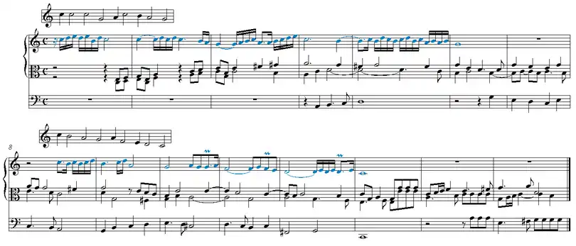 The preludes are quite varied in style and structure, and are therefore hard to categorize, as no two praeludia are alike.[3] The texture of Buxtehude's praeludia can be described as either free or fugal.[11] They consist of strict diatonic harmony and secondary dominants.[11] Structure-wise, there usually is an introductory section, a fugue and a postlude, but this basic scheme is very frequently expanded: both BuxWV 137 and BuxWV 148 include a full-fledged chaconne along with fugal and toccata-like writing in other sections, BuxWV 141 includes two fugues, sections of imitative counterpoint and parts with chordal writing. Buxtehude's praeludia are not circular, nor is there a recapitulation. A fugal theme, when it recurs, does so in a new, changed way.[11] A few pieces are smaller in scope; for example, BuxWV 144, which consists only of a brief improvisatory prelude followed by a longer fugue. The sections may be explicitly separated in the score or flow one into another, with one ending and the other beginning in the same bar. The texture is almost always at least three-voice, with many instances of four-voice polyphony and occasional sections in five voices (BuxWV 150 being one of the notable examples, with a five-voice structure in which two of the voices are taken by the pedal).