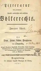 • Dietrich Heinrich Ludwig von Ompteda: Literatur des ges. sowohl natürlichen als positiven Völkerrechts. Regensburg 1785 (dem kursächsischen Comtialgesandten Carl Anton Friedrich Graf von Hohenthal gewidmet)