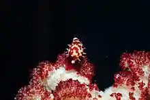 A false cowry (Diminovula culmen) inhabiting a soft coral (Dendronephthya sp.)