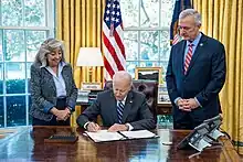 Titus and Rep. John Katko (R-NY) watch President Joe Biden sign a bill they sponsored.
