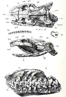 Dinilysia (meaning "terrible ilysia") is an extinct genus of snake from the Late Cretaceous (Coniacian) of South America. Dinilysia was a relatively large ambush predator, measuring approximately 2 m (6.6 ft) long. The skull morphology of Dinilysia is similar to boids, suggesting that it was able to consume large prey. Living in a desert-like environment, Dinilysia is likely a terrestrial or a semi-fossorial animal.[1]