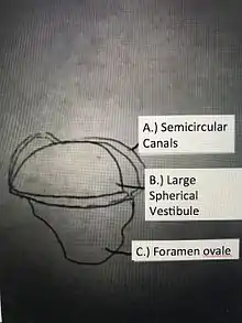 The Dinilysia patagonica is a stem snake that is very closely related to the original ancestor of the clade of crown snakes.[2] Once the fossil of the snake was discovered, an x-ray computed tomography was used to build a digitized endocast of its inner ear. The results displayed that the Dinilysia patagonica's inner ear anatomy had three main parts. It had a large spherical vestibule, large foramen ovale, and slender semicircular canals in its inner ear.[2]