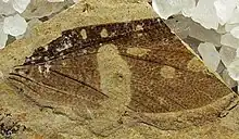 Only a single poorly preserved D. wilsoni hindwing has been found, but the shape is distinct enough to separate it from the other Dinokanaga species, being broadly a rounded oval.[1] The sole specimen was found the Whipsaw Creek locality of the Allenby Formation near Princeton, British Columbia, and named for Dr. Mark Wilson of the University of Alberta.[1]