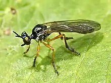 Dioctria bicincta can reach a body length of about 7–9 mm (0.28–0.35 in).[4] These robber flies have a more or less shiny black thorax. Also the abdomen is usually black, sometimes with partly reddish marks on the middle tergites. In males the hind metatarsi are very swollen.[5] The front and middle tibia and femora are mainly yellowish. This species is rather similar to Dioctria linearis (drawing of the abdomen and color of the legs are almost identical)[5] and to Dioctria gracilis (females of these two species cannot be easily separated).[6][7]
