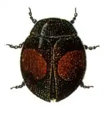 This small beetle is only 2.5 millimetres long. It is a deep shade of greenish-black with two large reddish-brown patches on the elytra. It is covered with very short pubescence.[3]