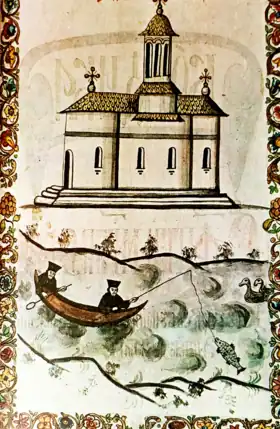 Also in 1795, Dionisie wrote down his Romanian translation of a 17th-century Slavonic writ by Prince Radu Mihnea, which is also a social document regarding the nature of serfdom in Wallachia. The scribe elicited some controversy for suggesting that the serfs had been "bound to the land" by order of an earlier ruler, Michael the Brave. While his translation was used as a main source of information by modern historians beginning with Nicolae Bălcescu, it is criticized as inaccurate by Constantin C. Giurescu, who believes that the incriminated words were not present in the Mihnea original (but rather added by Dionisie).[33] At some point before 1796, he copied and translated Slavonic diplomas from the Tismana archives, attributed to Sigismund of Luxemburg, Holy Roman Emperor (whom he knew as Zicmond) and John Hunyadi (Ianoș). Unbeknown to him, these were forgeries prepared by the local monks to protect their rights during the fist Habsburg occupation of Oltenia (c.1730).[34] By 1799, Dionisie was known to be working on another register, for the monks of Titireciul, in Ocnele Mari.[35] He became a ktitor (founder) of skete in Mănăilești, Vâlcea, and was depicted as such in its murals,[36][37] done in 1801 by Dinu of Craiova.[38]
